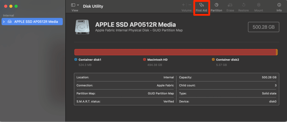 Välj din Apple SSD och välj Första hjälpen högst upp. Följ alla anvisningar på skärmen.