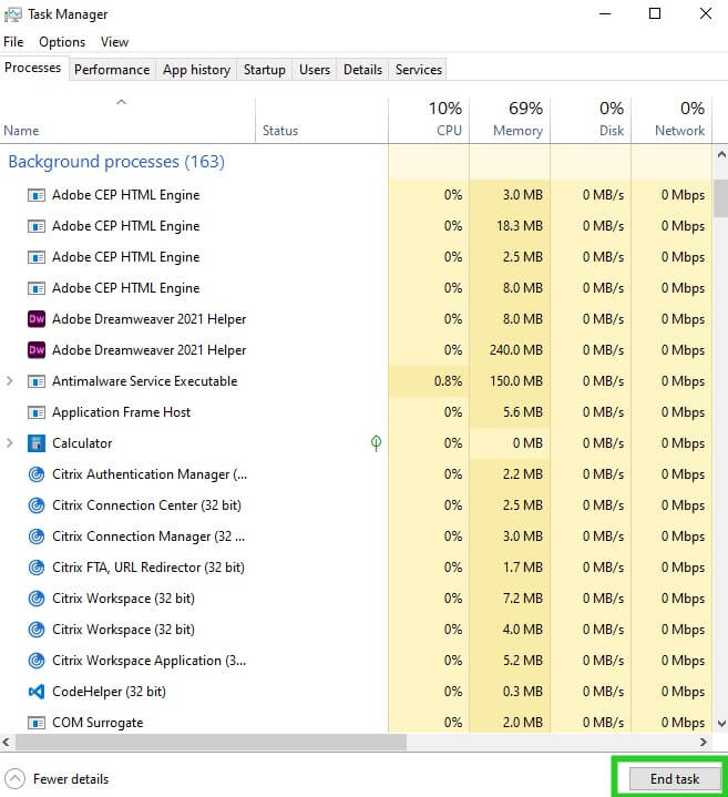 Steg 2.Klicka på bakgrundsprocesserna som tar upp det mesta av minnet genom att trycka på"Avsluta uppgift".