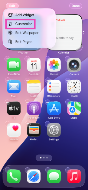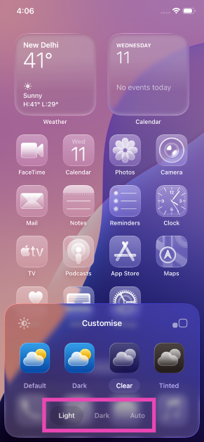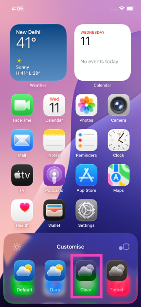 När din iPhone har uppdaterats till iOS 26, tryck på en tom plats på startskärmen, tryck på "Redigera"-knappen i det övre högra hörnet av skärmen och välj "Anpassa". Välj "Rensa" från listan med alternativ och välj ett visningstema.