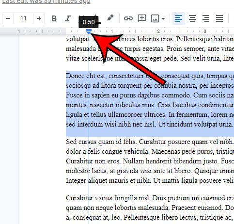 Det finns dock ett par kontroller på linjalen som gör att du kan utföra det du försöker göra. Vår guide nedan visar dig hur du drar in den andra raden i Google Dokument.