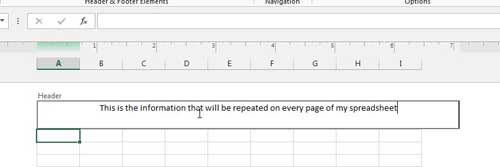 Nu när du vet hur du infogar en rubrik i Excel 2013 kan du använda det här alternativet för att placera innehåll på den platsen så att det är synligt på varje sida i ditt utskrivna kalkylblad.