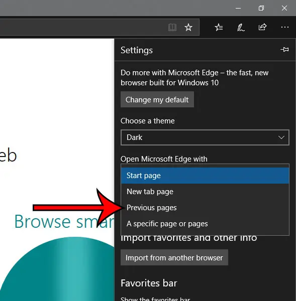 Steg 4: Klicka på rullgardinsmenyn underÖppna Microsoft Edge med, välj sedanTidigare sidoralternativ.