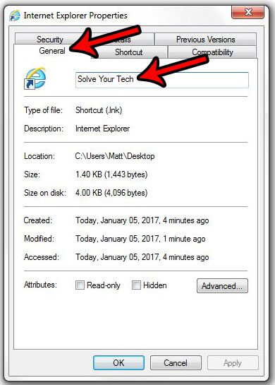 Genvägsikonen säger förmodligen namnet på webbläsaren just nu, vilket kanske inte är så användbart. Om du återvänder tillEgenskaperfönstret kan du klicka påAllmänfliken högst upp i fönstret och ersätt sedan värdet i det översta fältet med det du vill kalla genvägen.