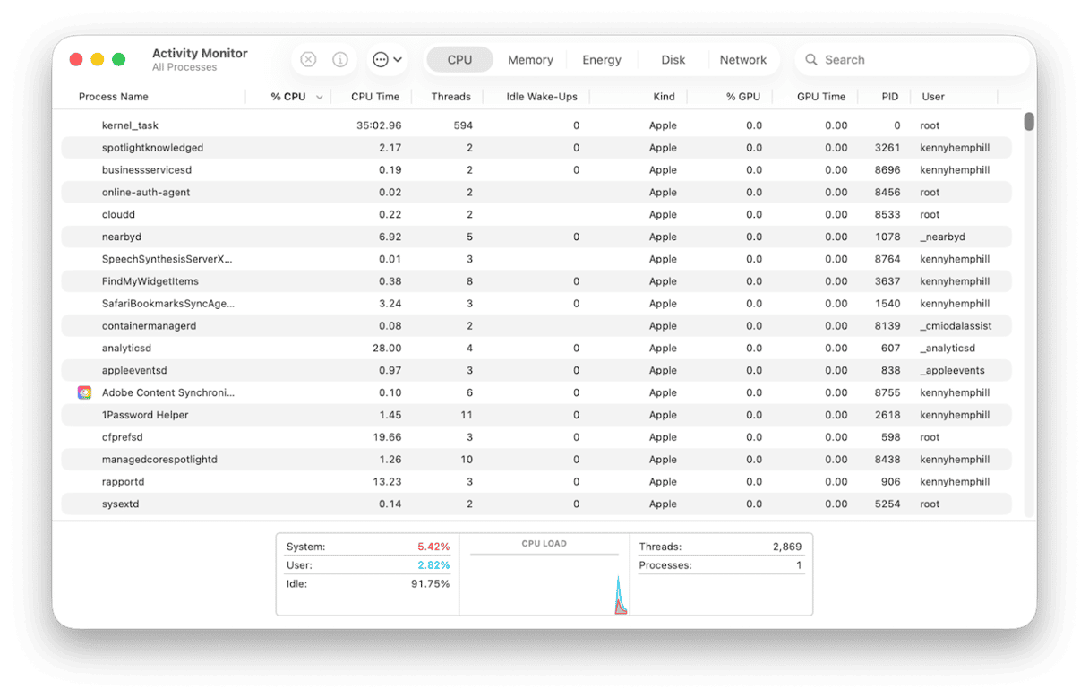 Activity Monitor (finns i mappen Applications > Utilities på din Mac) är ett utmärkt verktyg för att undersöka vilka appar eller processer som saktar ner din dator. Starta den och välj sedan en kolumn – t.ex. CPU – för att ordna processer efter de resurser de använder. Du kan sedan bestämma om du vill avsluta den appen eller processen. Men om du inte är säker på vad en process gör bör du ta reda på det (googla den) innan du avslutar den; det kan vara en viktig systemprocess.