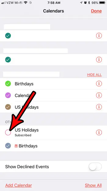 Vår guide fortsätter nedan med ytterligare information om hur du tar bort helgdagar från en iPhone-kalender, inklusive bilder på dessa steg.