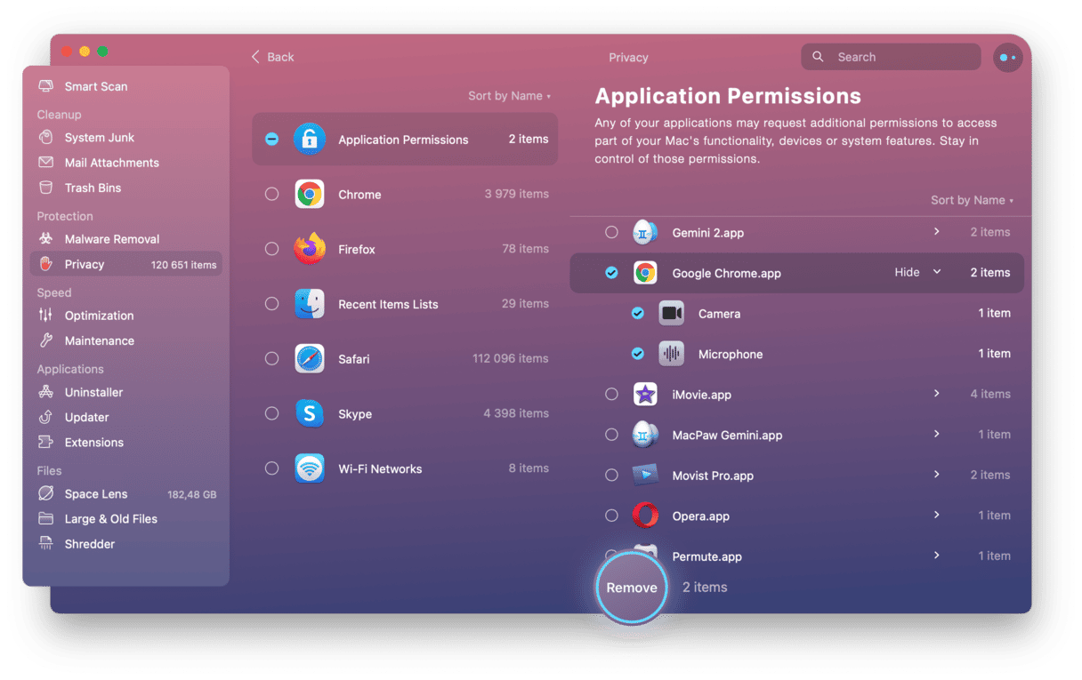 På så sätt kan du ge och återkalla behörigheter till kameran, mikrofonen eller andra viktiga delar av din Mac. Om du till exempel tror att din Chrome-app har ett virus kan du förbjuda den här från att använda din kamera.