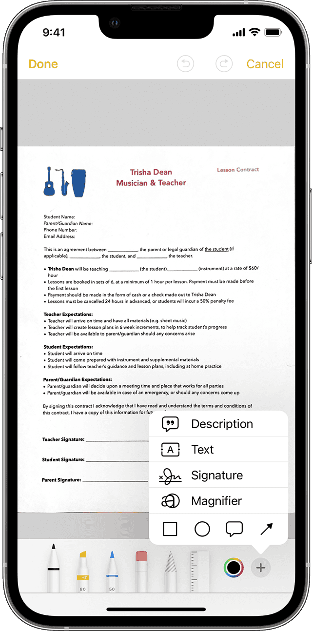 - Signera dokument:Lägg till din signatur i skannade dokument direkt i Notes-appen.