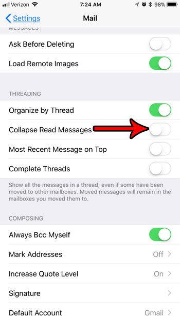 Det finns en handfull inställningar som påverkar dessa e-posttrådar i Mail-appen på din iPhone, och en av dessa inställningar gör att e-postmeddelanden som du redan har läst komprimeras när du tittar på tråden.