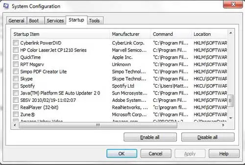 Klicka på rutan till vänster omSpotifyför att ta bort bocken. Observera att du också kan använda den här möjligheten för att förhindra att andra program startas när din dator startar, men var försiktig med att ta bort program som du inte känner igen eller är osäker på. Du kan skapa problem på din dator om du oavsiktligt inaktiverar program eller program som din dator behöver för att fungera korrekt.