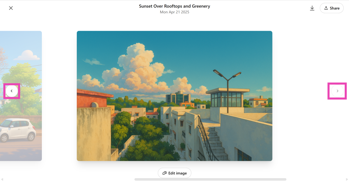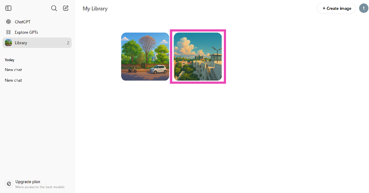 Biblioteket på ChatGPT låter dig ladda ner, redigera och dela dina bilder. Det finns dock inget alternativ att ta bort en bild ännu. Om du vill ta bort en bild från biblioteket måste du ta den längre vägen att spåra konversationstråden och ta bort den. Om du använder ChatGPT-appen på din telefon blir den här uppgiften enklare eftersom du kan gå till konversationen från bilden. På en PC måste du bläddra igenom sidofältet tills du hittar tråden.