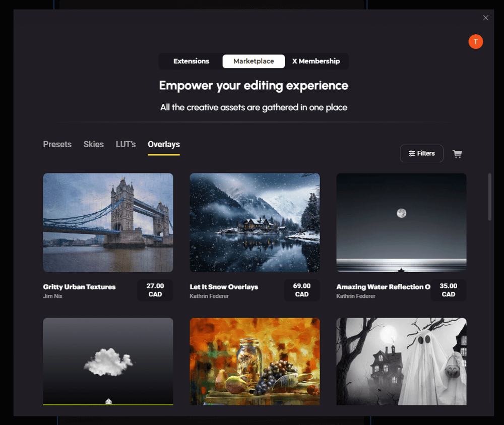 Observera att dessa priser är i kanadensiska dollar, men det är väldigt dyrt i vilken valuta som helst för vad du får.Istället är deras mål att låta dig snabbt byta in nya skyar och överlagringseffekter som de kan sälja till dig som bildtillgångar på Luminars inbyggda marknadsplats. För mig låter idén att betala $20-30 eller mer för ett enda förinställt paket eller överlagringsset helt löjligt, men andra verkar inte ha något emot det.
