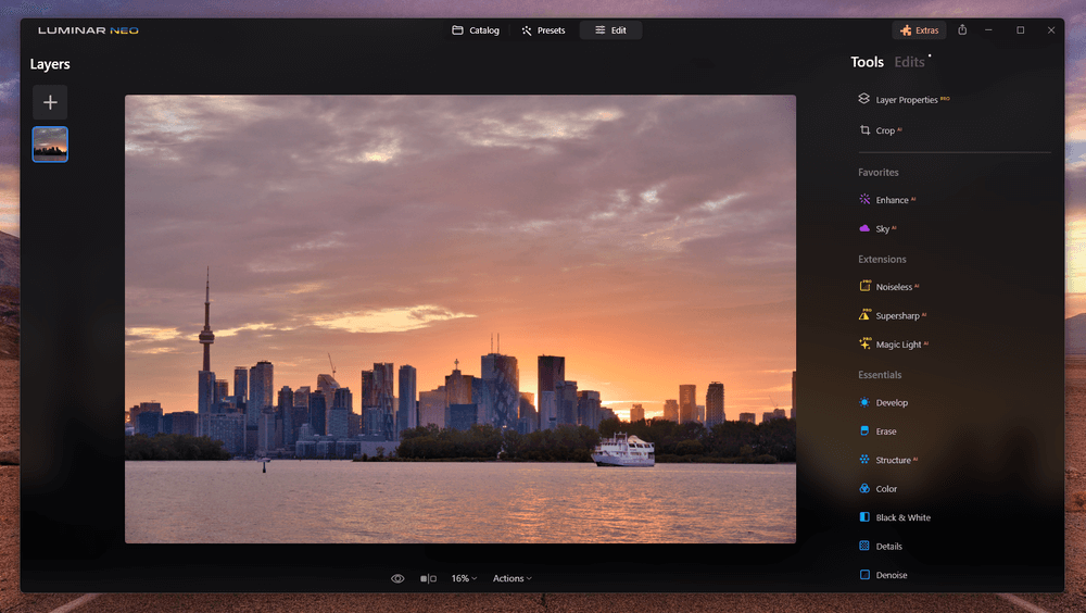 Luminar Neoär den senaste versionen i en lång rad utgåvor från Skylum, avsedd för nybörjare och fotoredigeringsentusiaster. Det är specialiserat på RAW-utveckling med hjälp av AI och automatiska verktyg för snabba redigeringar, så det är bättre för kreativ fotoframkallning istället för högprecisionsredigeringstekniker. Den är tillgänglig som månadsprenumeration eller som engångsköp på både Windows och macOS.