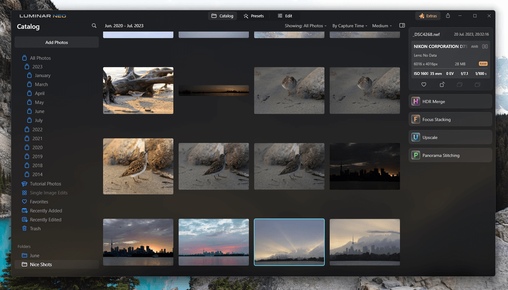 Den här kategorin kan verka lite orättvis eftersom det är en total giveaway för Luminar Neo, även om den bara har mycket grundläggande bibliotekshanteringsverktyg i sin katalogmodul. När den placeras i jämförelse med nästan vilken bildredigerare som helst förutom Affinity Photo, skulle Luminar förmodligen förlora, men det får ett gratispass här eftersom Affinity Photo inte innehåller några bibliotekshanteringsverktyg alls.
