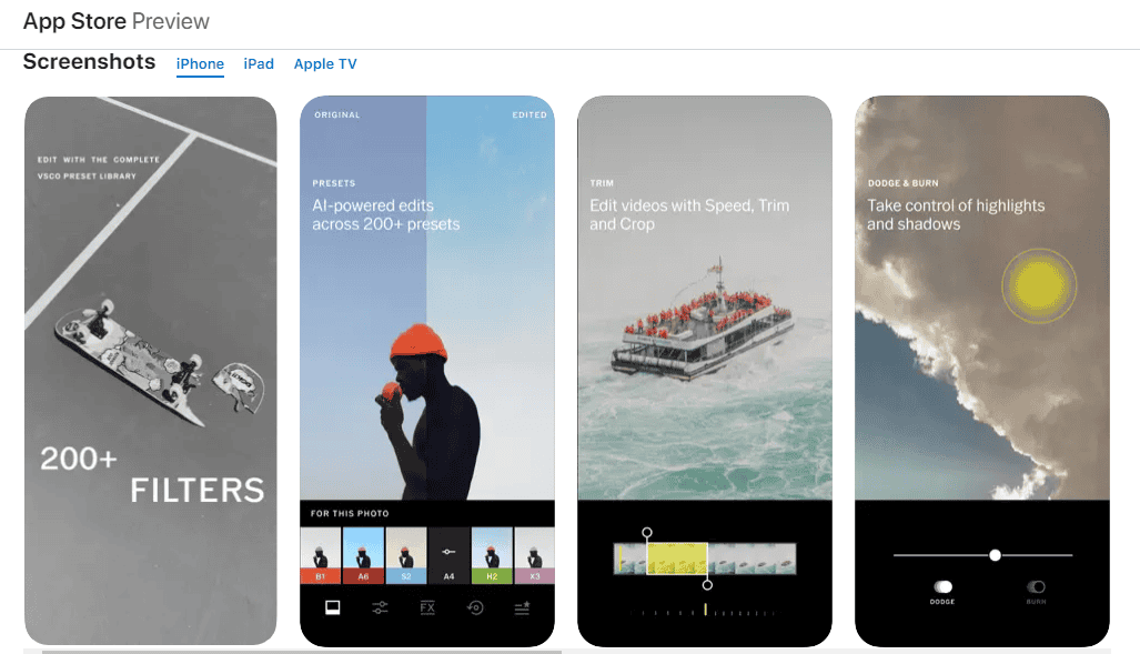 - VSCO:Känd för sin omfattande samling av konstnärliga filter och förinställningar, VSCO är ett utmärkt val för att lägga till en unik touch till dina foton. Den erbjuder också avancerade redigeringsverktyg och en gemenskapsplattform för inspiration och delning.