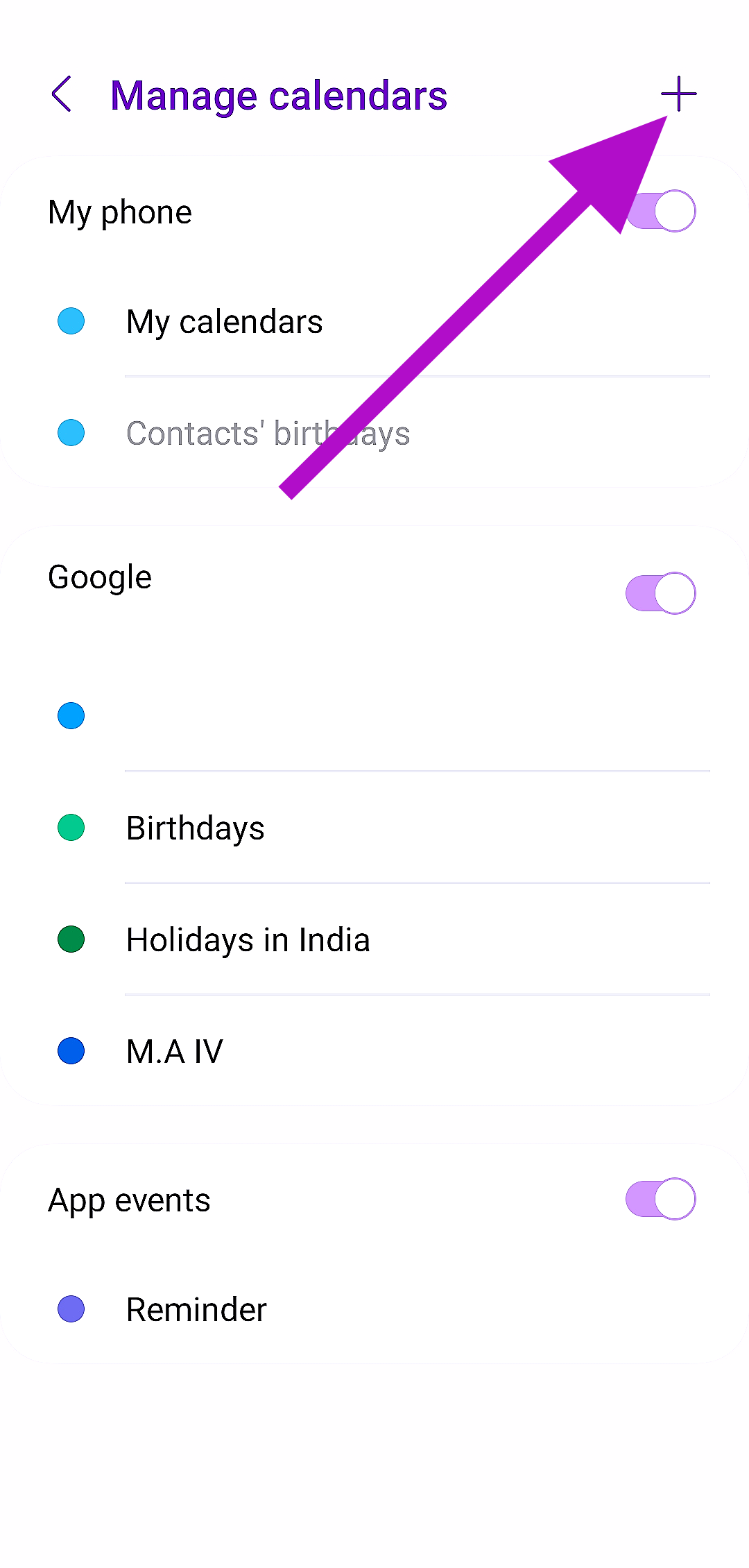 Om du använder flera Google-konton kan du ha glömt att lägga till kalendern du letar efter i Samsungs inbyggda kalenderapp. För att lägga till en ny kalender, gå tillMeny>Inställningar>Hantera kalendrar>Plusikonoch logga in med ditt Google-konto.