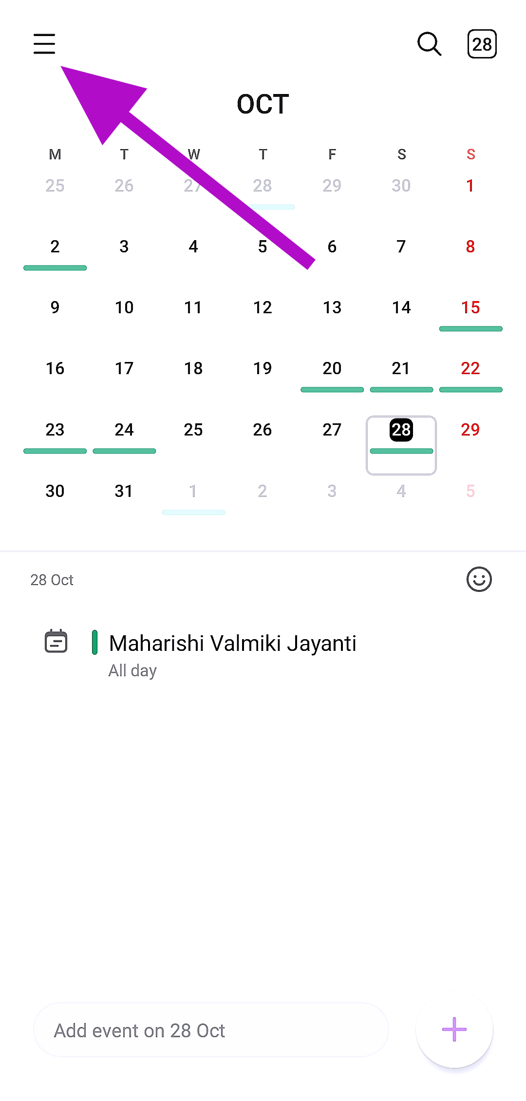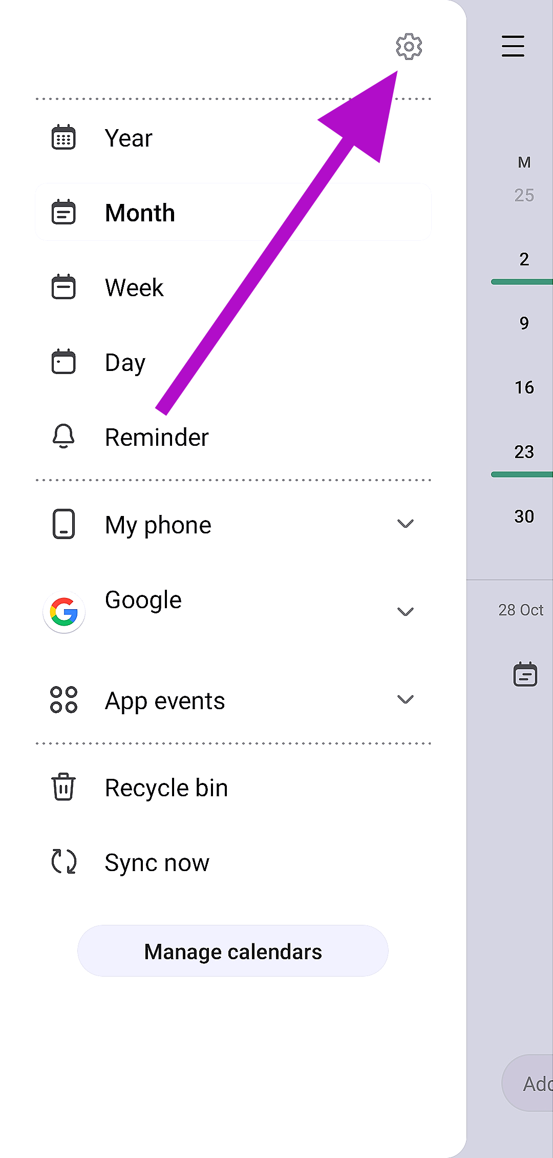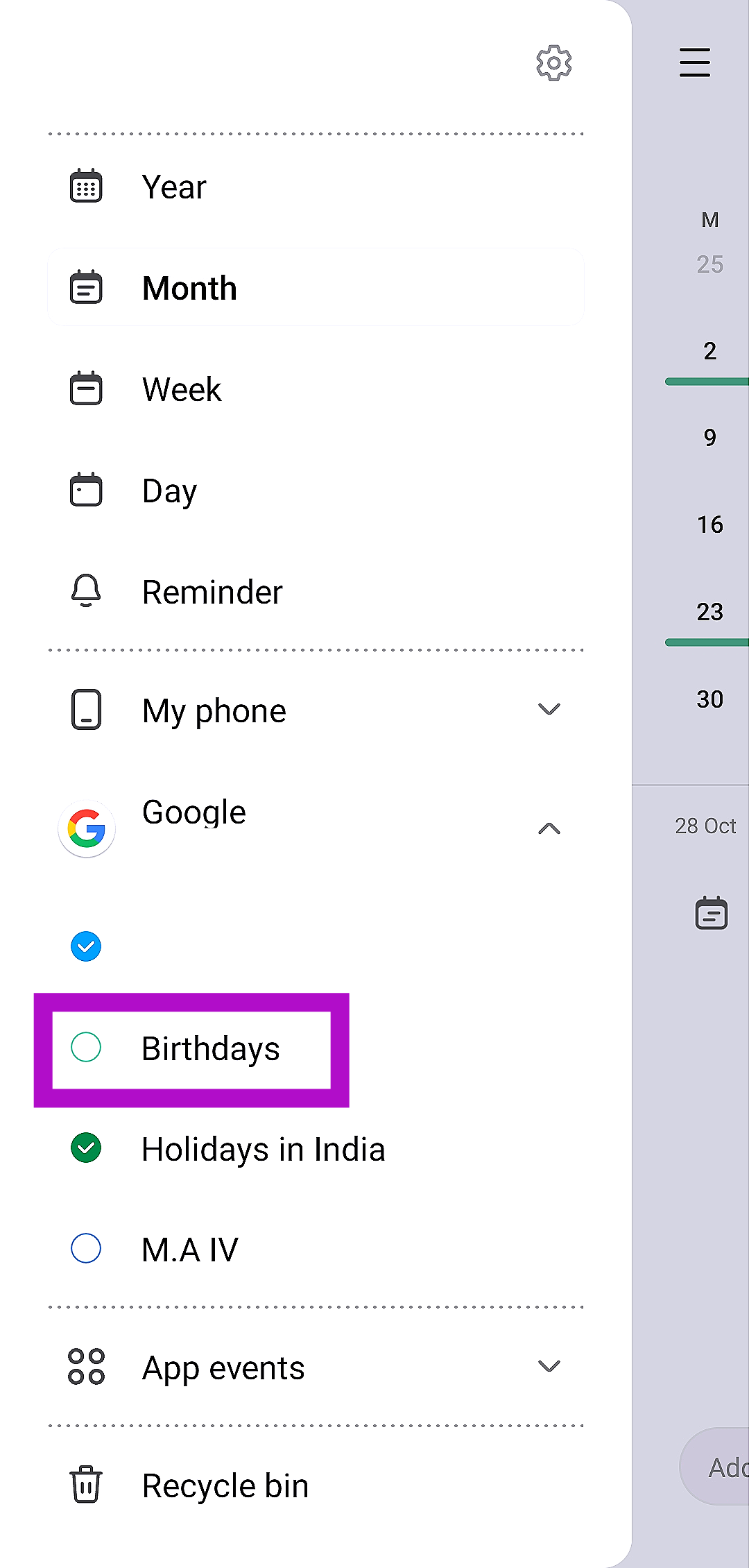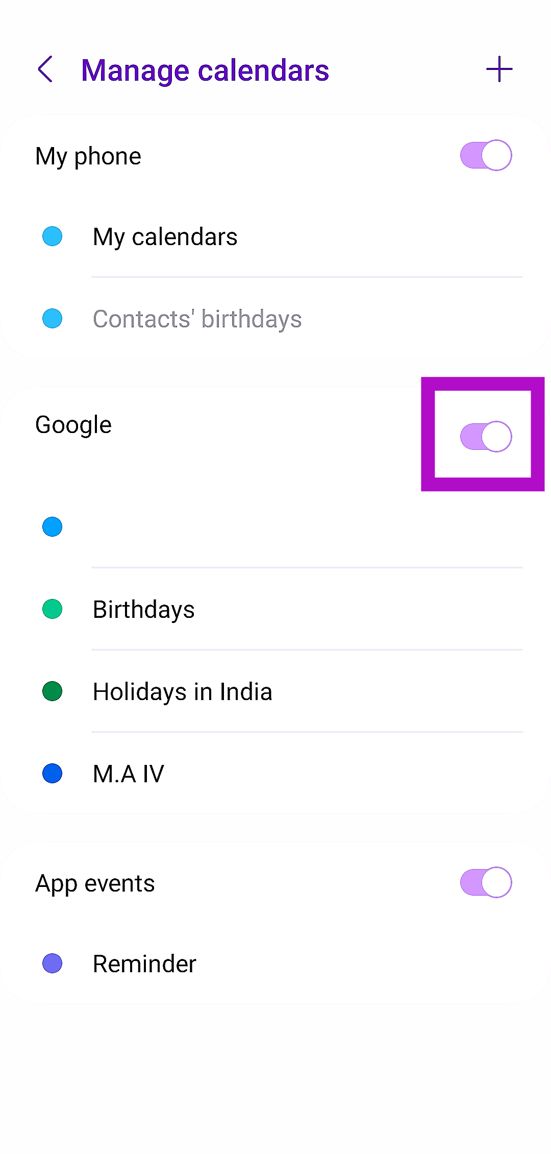 För att börja synkronisera, gå till Samsung Calendar-appen, tryck på hamburgermenyn, gå till inställningar och slå på växelströmbrytaren för ditt Google-konto.