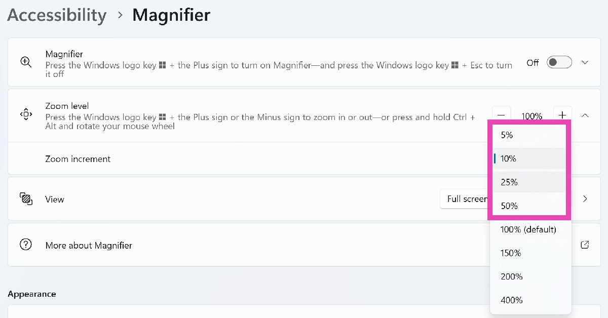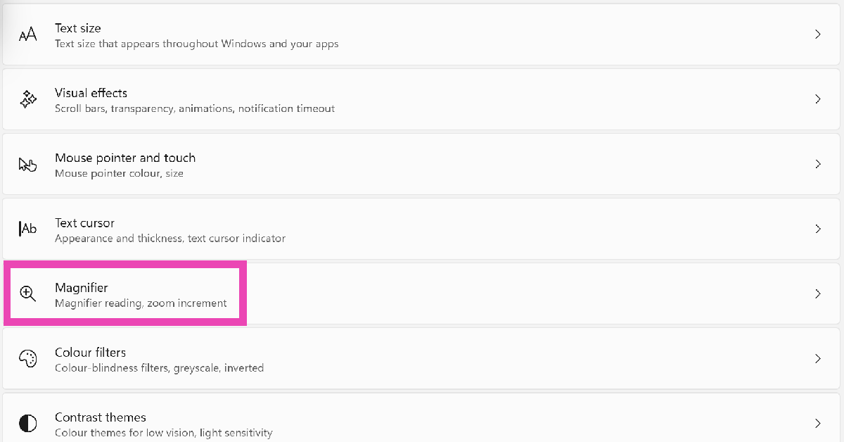Tryck påWindowsoch+tangenterna tillsammans för att aktivera förstoringsverktyget på din PC. Du kan ändra dess inkrementnivå genom att gå tillInställningar>Tillgänglighet>Förstoringsglas.