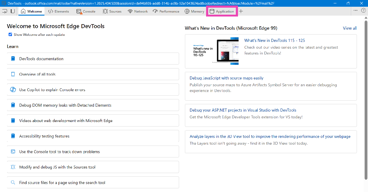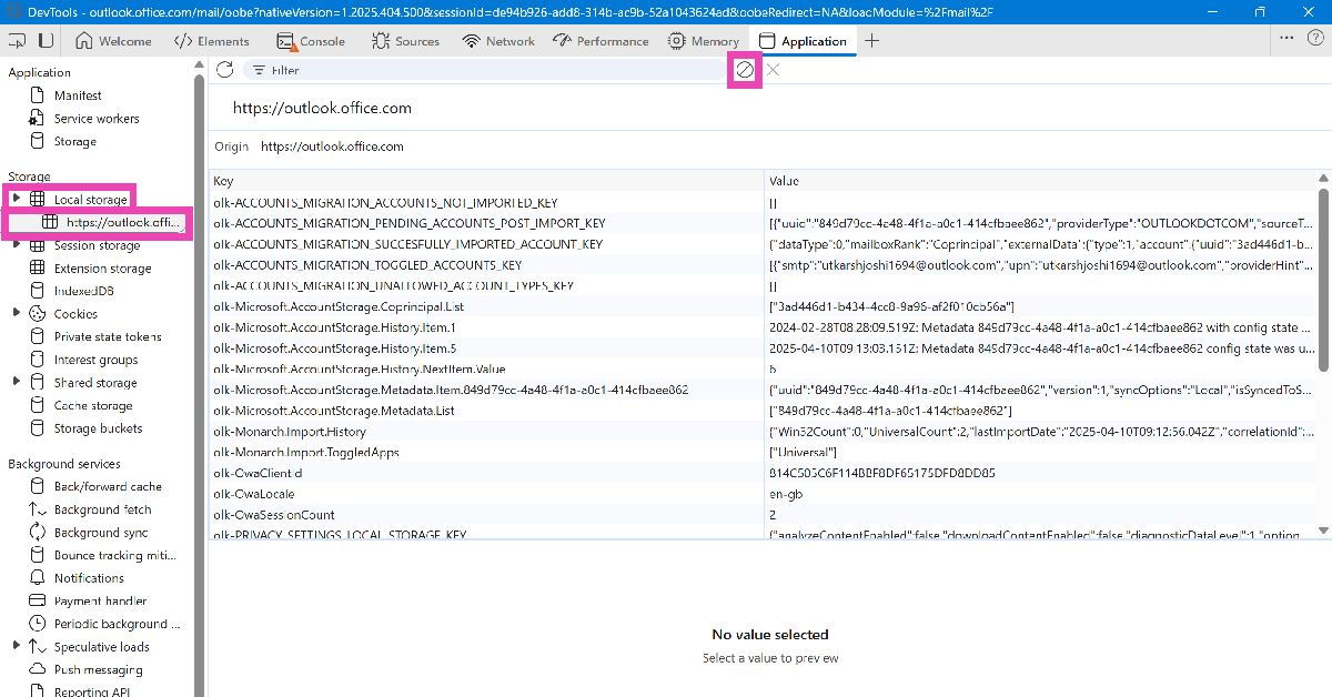 TryckaWindows + Roch skriv in olk.exe –devtools i rutan Kör. Gå tillApplikationer>Lokal lagring, välj Outlook och tryck på "Rensa".
