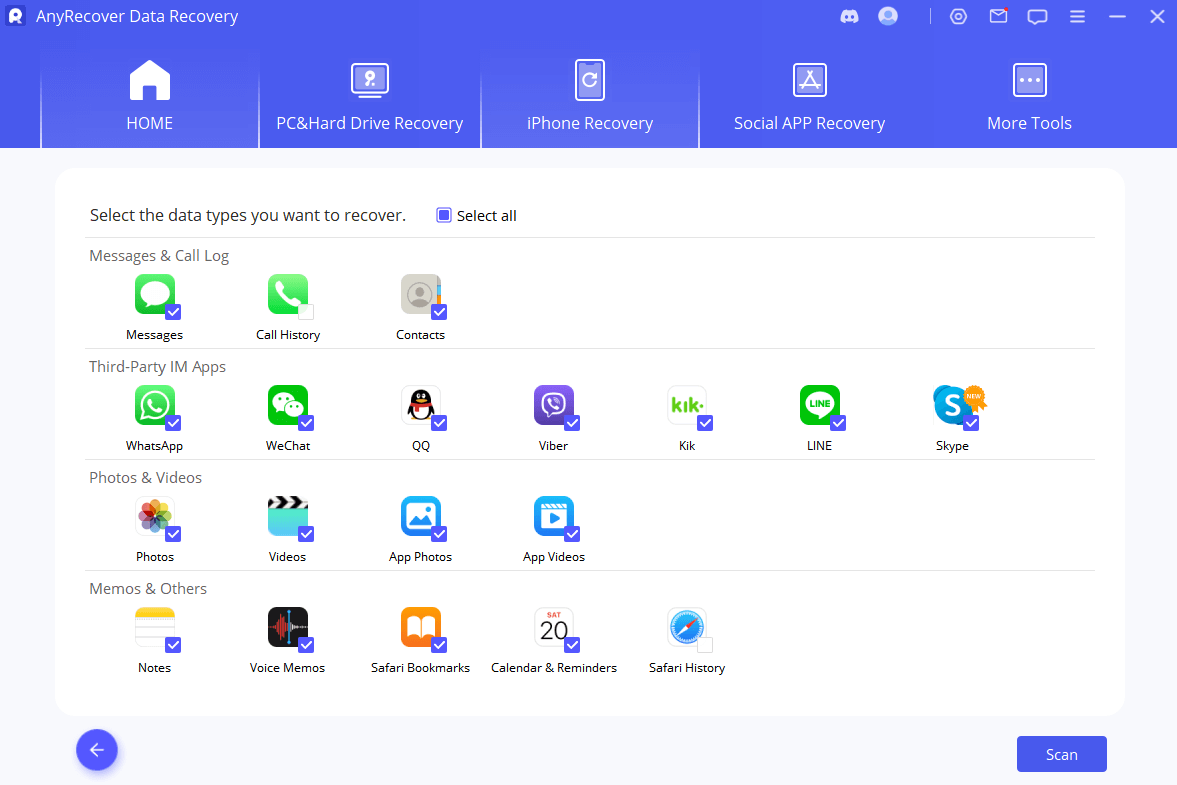 Efter att ha startat AnyRecover kan du direkt välja och ange "iPhone Recovery", och sedan välja en modul att återställa.Steg 2: