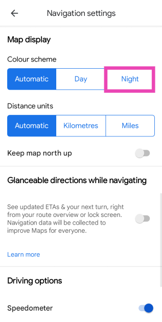 Starta Google Maps-appen, tryck på din profilbild, gå till Inställningar, tryck på "Navigation" och välj sedan "Natt" i kategorin "Färgschema".