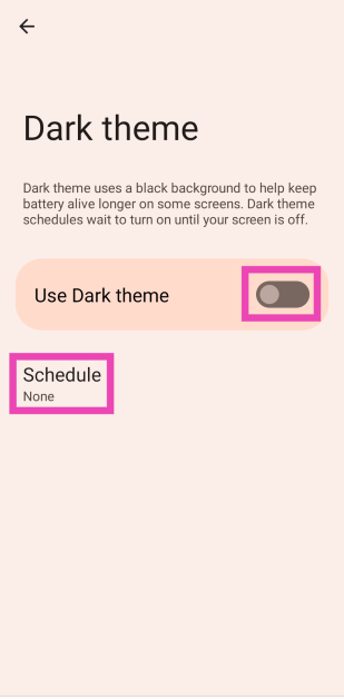 Steg 3:Slå på vippströmbrytaren förAnvänd mörkt temaoch ställ inSchema.
