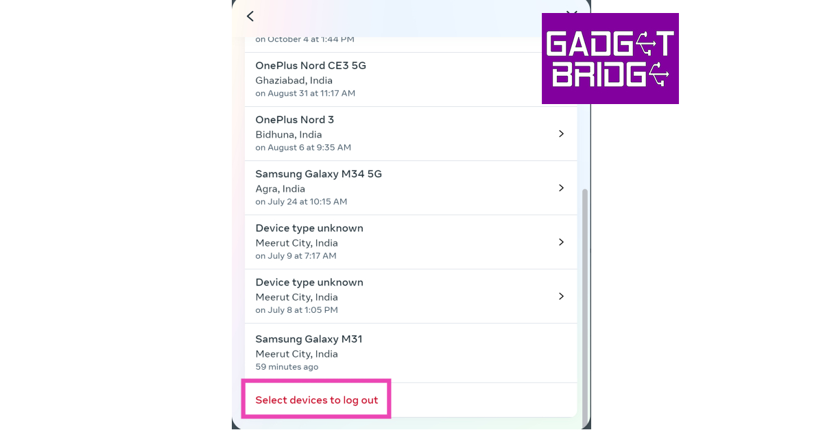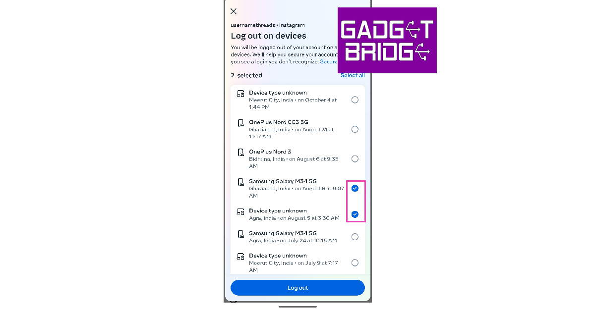 Steg 7:Klicka på den eller de enheter du vill ta bort från ditt Instagram-konto och tryckLogga ut.