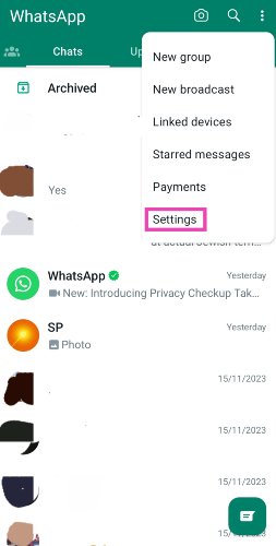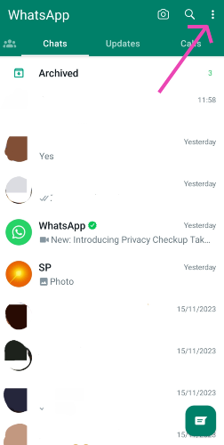 Steg 1: LanseraWhatsApp på din telefon och tryck påellipseri det övre högra hörnet av skärmen.