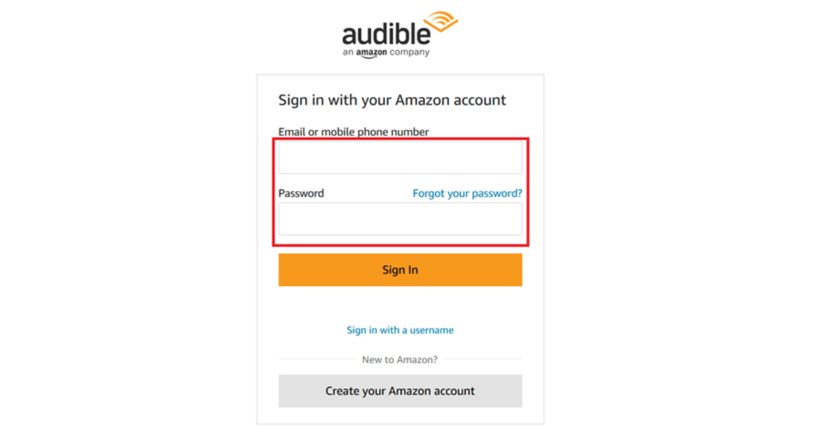 Steg 1:Logga in med dina Audible/Amazon-kontouppgifter. Om du inte redan är inloggad besöker du Audibles webbplats och anger dina kontouppgifter.