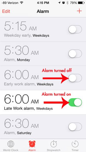 Observera att målet med stegen nedan är att ta bort den klockikonen, så att du kommer att stänga av alla larm som för närvarande är aktiva på din iPhone.