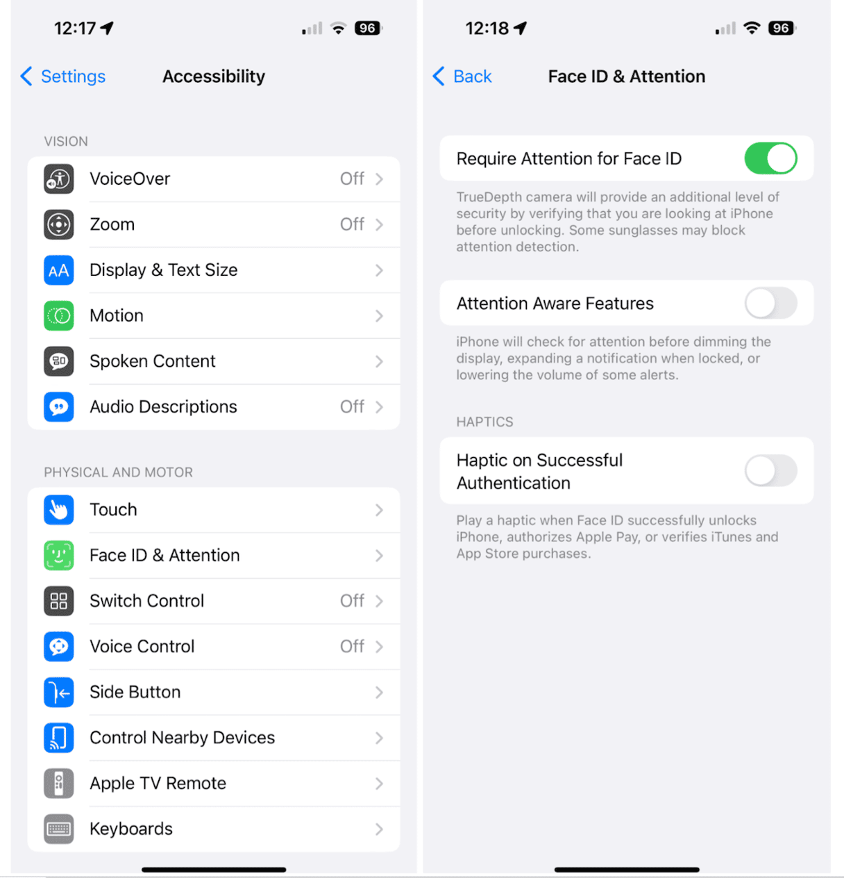 En annan inställning som kan påverka ljusstyrkan på din iPhone är de så kallade "Attention Aware Features". Med den här funktionen aktiverad kommer din iPhone i princip att dämpas när den upptäcker att du inte tittar på den. Du kan enkelt inaktivera den här inställningen genom att följa dessa steg: