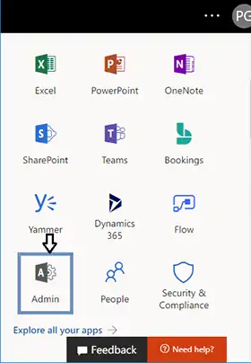 - Melden Sie sich bei Ihrem Microsoft Office 365 anKonto mit globalen Administratoranmeldeinformationen. Klicken Sie aufAdminOption zum Starten des Microsoft 365 Admin Center.