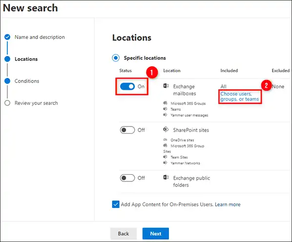 Aufmerksamkeit:Wenn Sie das „Inhaltssuche”-Option, dann stellen Sie sicher, dass Sie die erforderlichen eDiscovery-Berechtigungen erfolgreich festgelegt haben. Darüber hinaus, wenn Sie Änderungen vorgenommen habeneDiscovery-Berechtigungen. Die Reflexion kann bis zu 24 Stunden dauern.