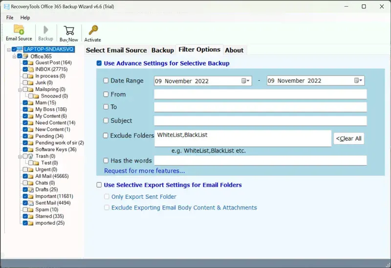 - Sie können die verwendenFilteroptionenum bestimmte E-Mails zu durchsuchen und zu exportieren.
