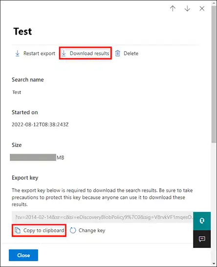 - Sobald der Exportvorgang abgeschlossen ist, müssen Sie auf klickenErgebnis herunterladenTab. Vergessen Sie nicht, das zu kopierenEinzigartiger Schlüsselindem Sie auf klickenIn die Zwischenablage kopierenOption. Dies ist zwingend erforderlich, da im nächsten Schritt nach einem eindeutigen Exportschlüssel gefragt wird.