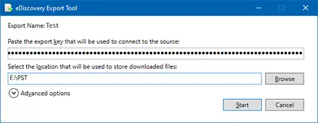 - Nun, dieeDiscovery-Exporttoolstartet automatisch, nachdem Sie auf „Ergebnisse herunterladen“ geklickt haben. Sie werden aufgefordert, den Exportschlüssel einzufügen, der zum Herstellen einer Verbindung zur Quelle verwendet wird.DurchsuchenDer Zielpfad zum Speichern der resultierenden PST-Datei. Klicken Sie aufStartKlicken Sie auf die Schaltfläche, um das Postfach von Office 365 in PST herunterzuladen.