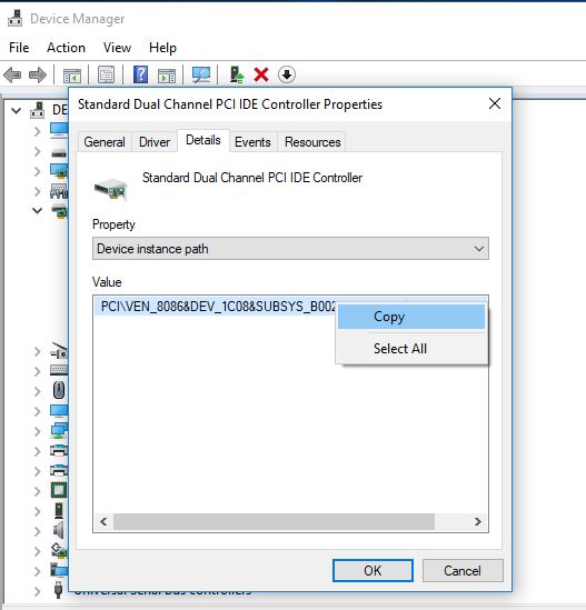Klicken Sie hier auf die Registerkarte „Treiber“ und dann auf „Treiberdetails“. Gehen Sie zur Registerkarte „Details“ und wählen Sie im Dropdown-Menü der Eigenschaft „Geräteinstanzpfad“ aus. Überprüfen Sie den Wert und kopieren Sie ihn mit der rechten Maustaste oder notieren Sie ihn. Wir haben zum Beispiel den Wert:PCIVEN_8086&DEV_1C08&SUBSYS_B0021458&REV_053&11583659&0&FD