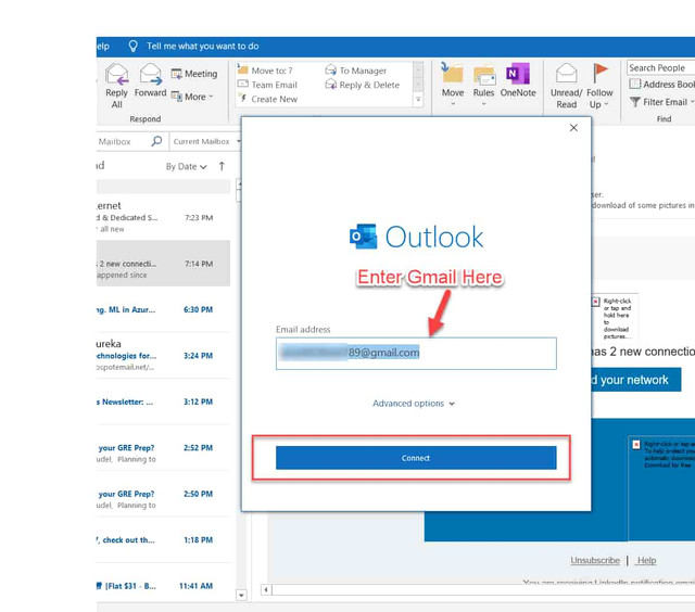 2. Klicken Sie auf Konto hinzufügen, geben Sie Ihre Gmail-E-Mail-Adresse ein und klicken Sie auf Verbinden.