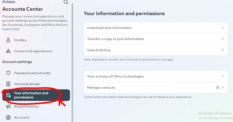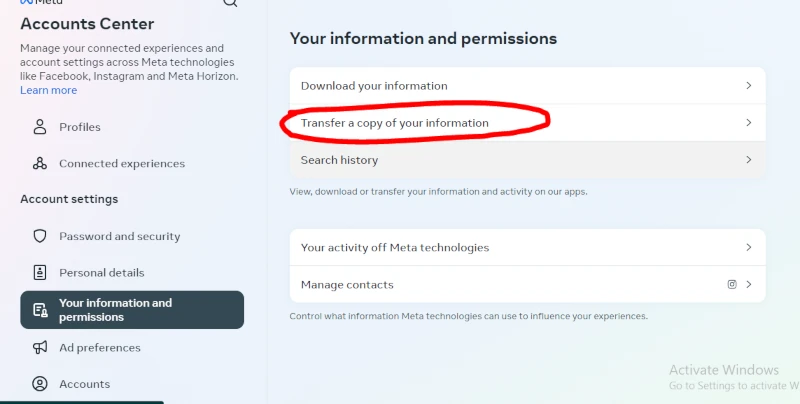 - Danach klicken Sie auf"Ihre Informationen und Berechtigungen"Dann tippen Sie auf"Übertragen Sie eine Kopie Ihrer Daten".