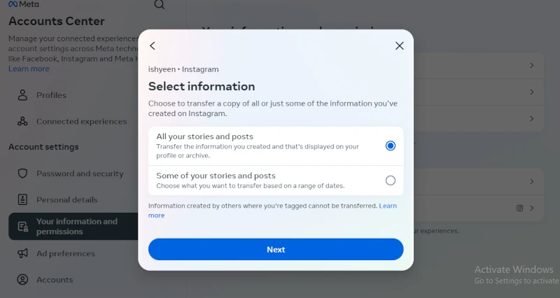 - Wählen Sie nun eine Option aus"Alle Ihre Geschichten und Beiträge"oder "Einige Ihrer Geschichten und Beiträge “dann klicken SieNächste.