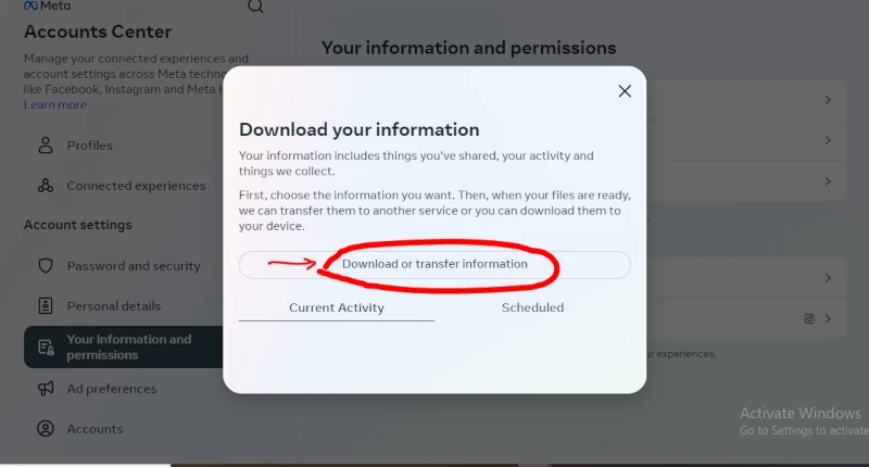 - Wählen Sie die aus"Aktuelle Aktivität"Registerkarte und klicken Sie auf"Informationen herunterladen oder übertragen".