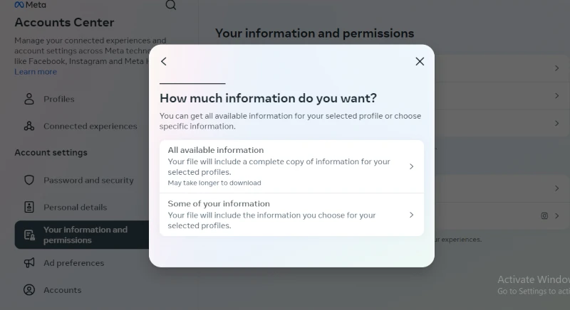 - Entscheiden Sie nun, wie viele Informationen Sie herunterladen möchten. Wenn Sie alle Daten von Instagram herunterladen möchten, klicken Sie auf"Alle verfügbaren Informationen".