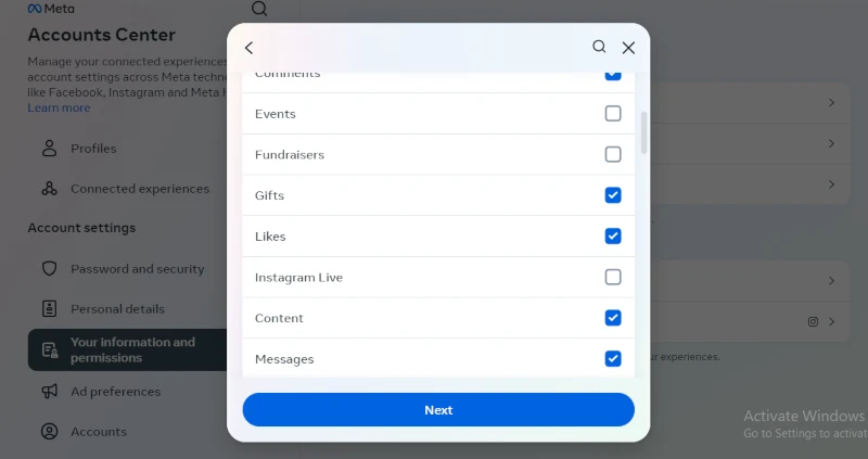 - Wenn Sie einige Ihrer Informationen auswählen, wählen Sie die Daten aus, die Sie herunterladen möchten, und drücken Sie dann klickenNächste.