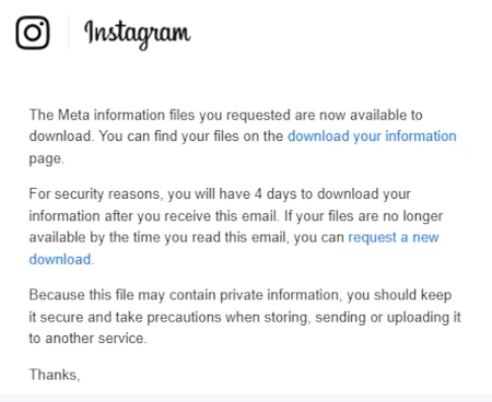 Darüber hinaus kann es bis zu 30 Tage dauern. Sobald Sie es erhalten haben, laden Sie es aus dem bereitgestellten Link herunter und behalten Sie ihn auf Ihrem Computer. Dies kann heruntergeladen werden, wenn der Instagram -Datenspeicher in der Regel etwa 2,5 GB liegt, aber je nach Qualität und ausgewählter Dateienarten variieren kann. Wenn Sie diese Vorsicht übertragen, können Sie nach Instagram die E -Mail -E -Mails in Instagram -Kontodaten für nur 4 Tage herunterladen.