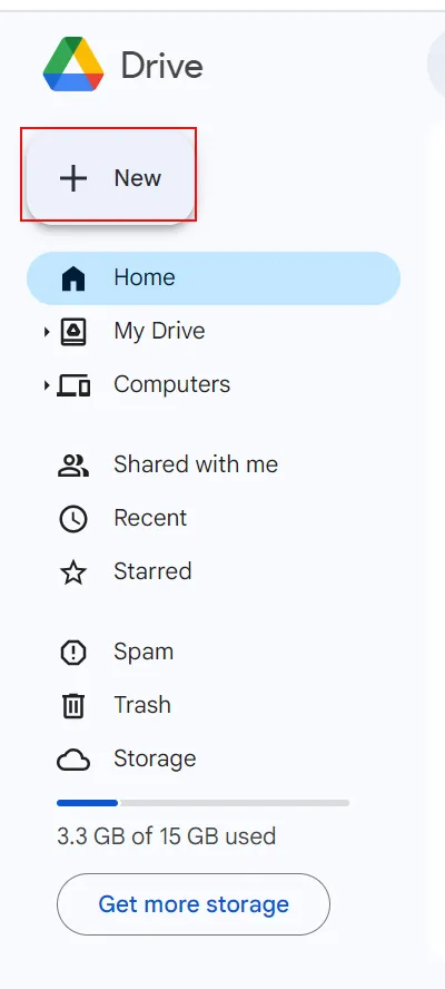 - Wählen Sie die ausNeuOption in Google Drive verfügbar.