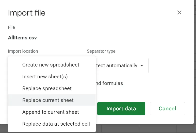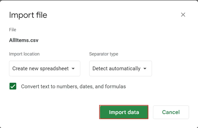- Drücken Sie die TasteDaten importierenSchaltfläche zum Importieren von CSV in Google Sheets.