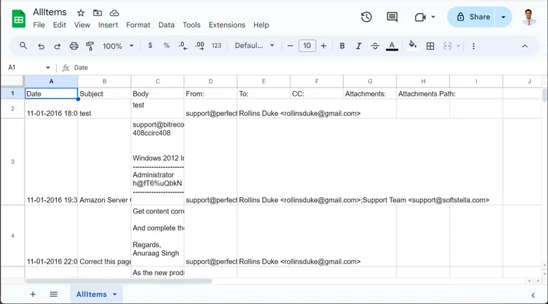 - Jetzt können Sie essiehe Gmail-E-Mails in Google Sheets.