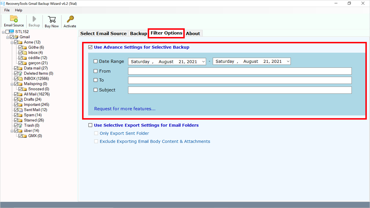 - SatzFilteroptionenentsprechend Ihren Anforderungen, um Gmail nahtlos nach Excel zu exportieren.