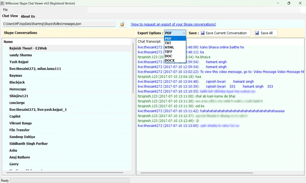Eine der besten Lösungen zum Herunterladen einer Skype-Konversation in eine PDF-Datei ist die Verwendung vonBitRecover Skype Chat Viewer, das viele High-Tech-Funktionen in der einfachsten Benutzeroberfläche bietet. Es ermöglicht dem Benutzer nicht nur das Anzeigen von Skype-Nachrichten, sondern konvertiert sie auch in andere Dateiformate wie PDF, TXT, HTML, TIFF, DOC, DOCX und mehr. Darüber hinaus unterstützt es alle Attribute des Skype-Chats, einschließlich Links und Multimedia, sodass die Originalität des Gesprächs erhalten bleibt. Allerdings muss man den Skype-Chatverlauf herunterladen, bevor man mit den professionellen Schritten fortfahren kann. Daher sind die Schritte zur Verwendung dieses Tools zum Exportieren des Skype-Chat-Verlaufs in das PDF-Format wie folgt: