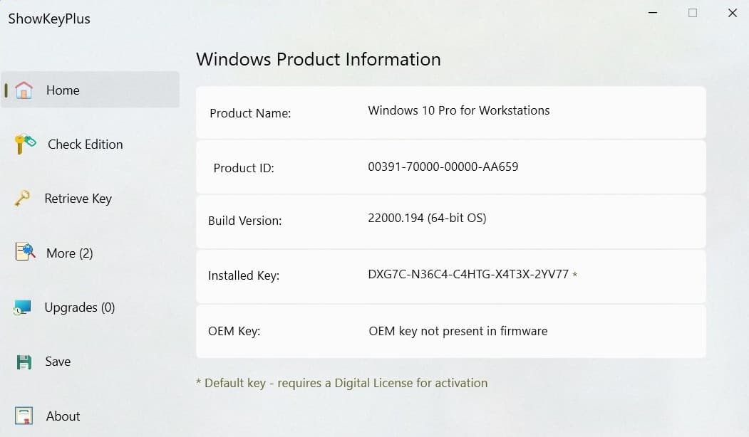 - ShowKeyPlus— Open Source, zeigt installierte und OEM-Schlüssel an und kann die digitale Produkt-ID extrahieren.