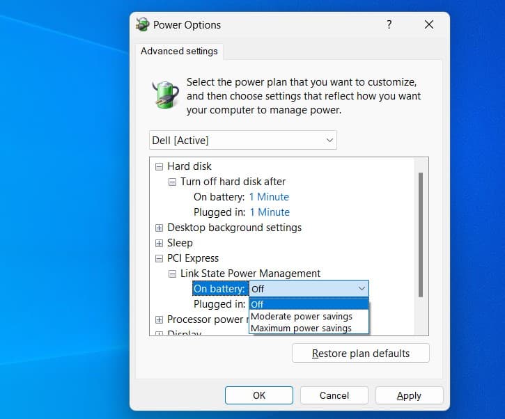 - Erweitern Sie PCI Express → Link State Power Management → stellen Sie es auf Aus.
